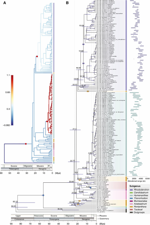 研究表明,叶绿体基因组能够较好地解决杜鹃花属的亚属间和多数物种间的系统发育关系。与前期基于叶绿体基因组和核基因组数据推断的系统发育比较,研究发现杜鹃花属包括13个稳定的单系分支;核和质体系统发育之间的强烈冲突则表明,深度分支可能发生过杂交/基因渐渗等网状进化事件。叶状苞杜鹃亚属(R. subg. Therorhodion)在始新世(约56 Mya)分化出来,经过始新世和渐新世(约32 Mya)的地史变迁,在中新世早期(23.8 ~ 17.6 Mya)一个相对较短的时期(约6 Mya之内)快速多样化形成了核心杜鹃属(共12个分支)的10个支系。以横断山和喜马拉雅地区为分化中心的两个亚属(代表了区域内90%以上的物种)多样化历史各不相同。杜鹃花亚属(R. subg. Rhododendron)在中新世早期(20.1 Mya)起源,多样化速率在随后(约16.6 Mya)显著增加,此后(约13.7 Mya)再分化出适应高海拔(Clade RH)和适应低海拔(Clade RL)的两个分支,这与横断山-喜马拉雅山脉中新世中期(约17 ~ 14 Mya)持续的地质构造事件并隆升至接近现今海拔高度相吻合。持续活跃的造山运动、气候变冷和亚洲夏季风加剧等因素导致的复杂地形、异质生境和扩散障碍等,促进了这两个分支发生平行的辐射物种形成。另一个以横断山和喜马拉雅地区为分化中心的亚属常绿杜鹃亚属(R. subg. Hymenanthes)则起源于中新世早期稍后(19.5 Mya),其冠群在中新世晚期(约10 Mya)开始分化,且多样化速率开始时较缓慢,而在早上新世(约5 Mya)扩散到横断山-喜马拉雅地区后发生快速辐射分化成种,其净多样化速率是杜鹃花亚属的近5倍。这可能是亚属常绿杜鹃亚属在横断山和喜马拉雅地区的扩散所致,同时,上新世的全球气候变冷和季风加强可能直接影响它的分化速率。常绿杜鹃亚属虽有一些分支仅包含适应高海拔的物种,但多数分支同时具有适应低海拔和高海拔的物种;与杜鹃花亚属相比,其海拔偏好可塑性更强,表明该亚属多样化过程中具有较强的生态可塑性。该研究对理解横断山-喜马拉雅地区的物种多样化形成历史与适应性进化提供了重要的研究案例。