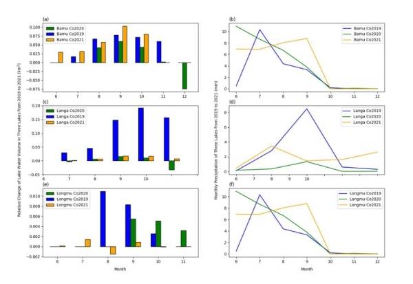 图3.2019-2021年湖泊水量相对月变化和降水月变化,(a、b)巴木错湖泊水量相对变化和降水,(c、d)拉昂错湖泊水量相对变化和降水,(e、f)龙木错湖泊水量相对变化和降水。