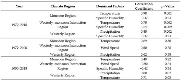 为了进一步厘清不同气候因子对湖泊变化的影响,研究人员对气温、降水、相对湿度和风速与湖泊变化的相关性进行计算。研究通过排序发现,不同气候区主导湖泊变化的气候因子不同,且不同时间段的主导因子也不同。在季风区,气温升高是促进湖泊扩张的主要原因;在西风-季风协同作用区,蒸发增加是导致湖泊萎缩的主要原因;在西风区,降水增加是促进湖泊扩张的主要原因。