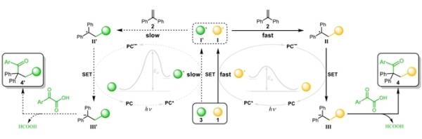 利用反应动力学上的差异,同时引入优势自由基前体和α-酮酸,该研究团队首次实现光催化动力学调控的烯烃α-酰化反应,包括氟代甲基酰化、烷基酰化、磺酰基酰化、硫醇酰化,甚至非对称性1,2-双酰化等双官能团化,高效实现了烯烃到复杂酮类化合物的转化。正如预期,该研究只引入α-酮酸,直接实现了1,4-二酮的构筑。该设计不仅为烯烃的α-酰化提供了全新策略,而且为光催化动力学控制的化学和区域选择性的烯烃双官能团化提供了空前的设计理念。