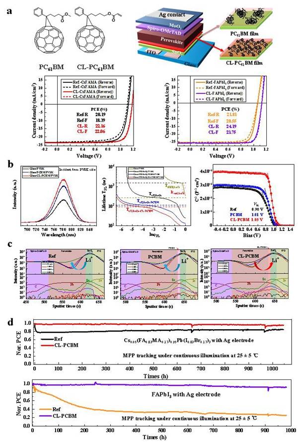 虽然该结构电池的运行稳定性得到提升,但是该类光伏电池运行过程中初始几十个小时内往往存在效率的快速衰减过程(burn-in衰减),严重降低了器件的稳定输出效率。针对该问题,研究团队通过器件结构设计及稳定性测试过程中器件内部离子分布、界面复合变化,证实该结构电池中的“burn-in”衰减与SnO2中Li+迁移至钙钛矿/空穴传输层界面有关。通过在SnO2/Perovskite界面引入一个薄层交联PC61BM(CL-PCBM)后可以抑制“burn-in”衰减。TOF-SIMS的结果证明了CL-PBM薄层可以将Li+离子固定在Perovskite/SnO2界面中,而且CL-PCBM的引入可以增加器件的内建电场并提高电子提取效率;最终在Cs0.05(FA0.85MA0.15)0.95Pb(I0.85Br0.15)3体系钙钛矿电池中获得了22.06%的效率,在光照下持续运行1000h后仍保留初始效率的95%,而参比电池仅保留75%;在FAPbI3体系钙钛矿电池中时,获得了24.14%的光电转换效率,同时也消除了“burn-in”衰减过程。这表明利用CL-PCBM界面修饰来消除“burn-in”衰减具有普适性。综上,通过降低器件工作过程中的Li+迁移可以大幅降低钙钛矿太阳能电池稳定性测试初期存在的“burn-in”衰减,提高器件的稳定输出功率(图3)。相关成果以Boosting Perovskite Solar Cells Efficiency and Stability: Interfacial Passivation of Crosslinked Fullerene Eliminates the "burn-in" Decay为题发表于Advanced Materials。