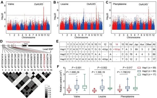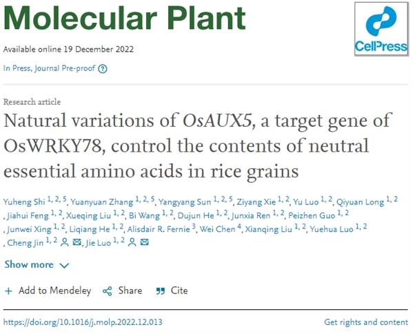 近日,罗杰团队在Molecular Plant (IF=21.9)上在线发表题为“Natural variations of OsAUX5, a target gene of OsWRKY78, control the contents of neutral essential amino acids in rice grains” 的研究论文。该研究利用全基因组关联分析(GWAS)鉴定到控制水稻籽粒多种EAA积累的关键基因OsAUX5,为水稻营养品质改良提供了重要基因资源。