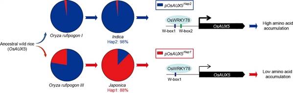 序列分析显示,大多数梗稻品种OsAUX5启动子区域都包含有一个18 bp的InDel序列插入,导致其上游调控因子OsWRKY78对OsAUX5 的激活能力变弱,进而导致梗稻品种中OsAUX5的表达量较低(图3)。作者对籼稻和梗稻OsAUX5等位基因(两个不同等位基因型)的分布和来源进行分析,发现粳稻的OsAUX5等位基因型来源野生稻(Or-III),而籼稻的OsAUX5等位基因型来自野生稻(Or-I),进一研究显示梗稻中的OsAUX5等位基因型受到了选择(图3)。将籼稻品种的OsAUX5等位基因引入粳稻品种中可以显著增加粳稻籽粒中EAA含量,同时不影响其它农艺性状表型。