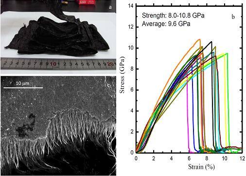 正因如此,碳纳米管有着极高的拉伸强度、杨氏模量和断裂伸长率。碳纳米管的理论强度可以达到钢铁的100倍,同时碳纳米管的密度又非常低,只有钢的1/6。