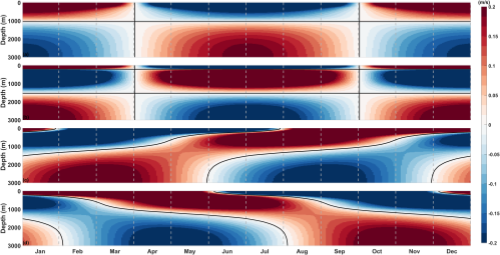 进入北菲律宾海盆的绕极下层水因地形阻挡无法流出该海盆,只能通过混合吸热上升变为北太平洋深层水,而后通过关键深水通道流出西太平洋。团队基于长达5年的观测研究发现,深层流上分支会在新几内亚岛以北通道向东流出西太平洋,流量为2.19 ± 11.4/1.62 Sv,并呈现显著的季节变化。流量的平均态受通道两端压力差异控制,季节变化由向西向下传播的罗斯贝波控制,均与上层海洋过程紧密联系。需要指出的是,该通道深层流上分支平均流向与前人基于温盐断面结果给出的结论正好相反(Kawabe & Fujio 2010),这一矛盾是由于前人间接观测的不准确或年际变化导致值得进一步研究。