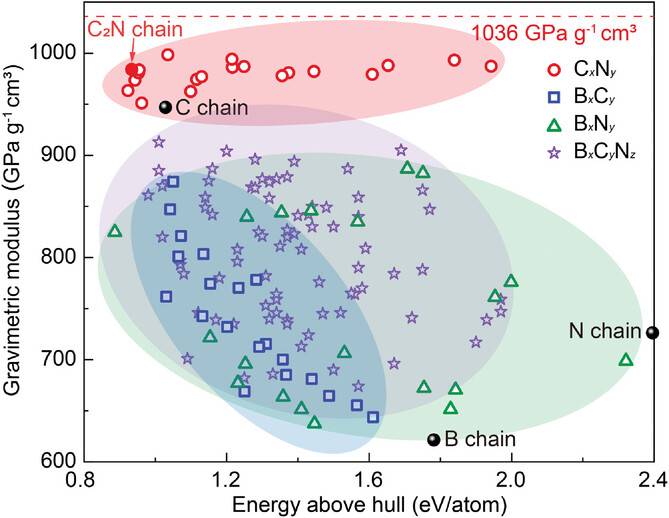 上述研究确定了杨氏模量等力学性能的理论极限,而现有材料的部分力学性能纪录与其理论极限相比尚存在巨大落差,这表明力学性能提升尚存在巨大创新研究空间。为此,课题组基于前期数据驱动发现的极致杨氏模量物质结构组分特征(Chem. Mater., 2021, 33: 1276),进一步开展固体力学理论设计。他们基于硼、碳、氮等轻质元素组合设计出大量物质结构,从中筛选出多种化学性质稳定、力学性能突破现有纪录的晶体结构,其中限域线性碳晶体的杨氏模量高达2973 GPa,接近于杨氏模量的理论极限(3074 GPa),线性氮化碳晶体比杨氏模量和比抗拉强度高达1032 GPa·g-1·cm3和108 GPa·g-1·cm3,大幅超越金刚石、石墨烯等已知高模量高强度材料,且接近于比杨氏模量和比抗拉强度的理论极限(1036 GPa·g-1·cm3和130 GPa·g-1·cm3)。