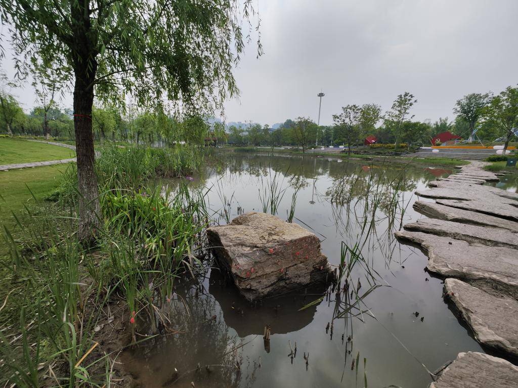 武汉市一个公园内,福寿螺卵块附着在石块和水草上。新华社记者 侯文坤 摄