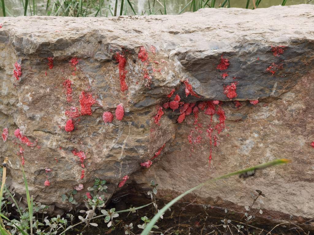 武汉市一个公园内,附着在石块上的福寿螺卵块。褚世海 摄