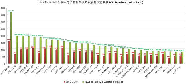 图2:2011年-2020年全球生物大分子晶体学线站发表论文总数和RCR排名