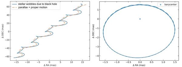PyMsOfa可用于CHES空间任务中对观测目标恒星与参考星的视场仿真(图2)以及获得的天体测量数据的解算等;PyMsOfa在天体测量领域相关计算的权威性使其可用于其他天文学研究前沿,如黑洞的观测(图3)、中国空间站巡天望远镜观测、小天体与行星深空探测、地球姿态预测及时间校准等。
