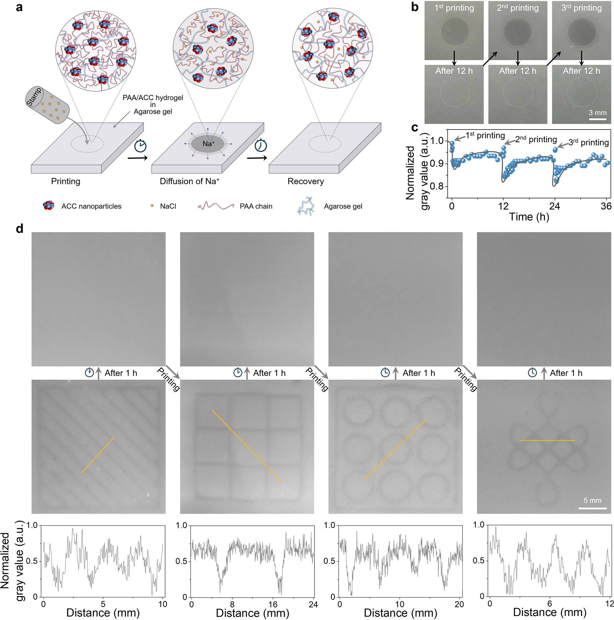 进一步地,研究人员团队构建了反应扩散的数学模型,揭示体系中化学反应、物质扩散和自组装的耦合机制。同时基于该水凝胶的动态结构化特性,研究人员展示了一种类脑动态信息存储系统的概念性应用,该存储系统具有良好的循环性,可在擦除后多次录入不同信息而不互相干扰。
