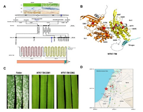 中国科学院遗传与发育生物学研究所研究员刘志勇与赵玉胜团队采用图位克隆、PacBio长读长基因组重测序、突变体和转基因功能验证等方法,克隆到广谱抗白粉病基因Pm36。Pm36编码一个新型的具有跨膜结构域的串联激酶(WTK7-TM)蛋白。白粉菌多小种鉴定发现,WTK7-TM对我国不同生态区的所有测试的104个白粉菌生理小种均表现出免疫或高抗。研究发现,Pm36位点存在明显的基因组扩张和新基因产生现象。EMS突变体实验发现,WTK7-TM的两个激酶结构域和跨膜结构域对于抗病功能至关重要。体外磷酸化实验初步证实,串联激酶WTK7-TM的两个激酶结构域对于自磷酸化和底物磷酸化的能力均是必需的。进化分析显示,两个激酶结构域可能是通过重复形式产生,属于“丝氨酸/苏氨酸”类型激酶。亚细胞定位发现串联激酶WTK7-TM定位于细胞质膜。基因溯源分析发现,Pm36基因稀有地分布在野生二粒小麦的南部居群,未参与小麦的进化过程,且在现代小麦基因库中缺失。该研究采用分子设计育种,将Pm36基因导入我国小麦主产区主栽品种,创制出高产而抗病的小麦新种质ZKPm36,为培育广谱抗白粉病小麦新品种提供了基因资源、奠定了理论基础。