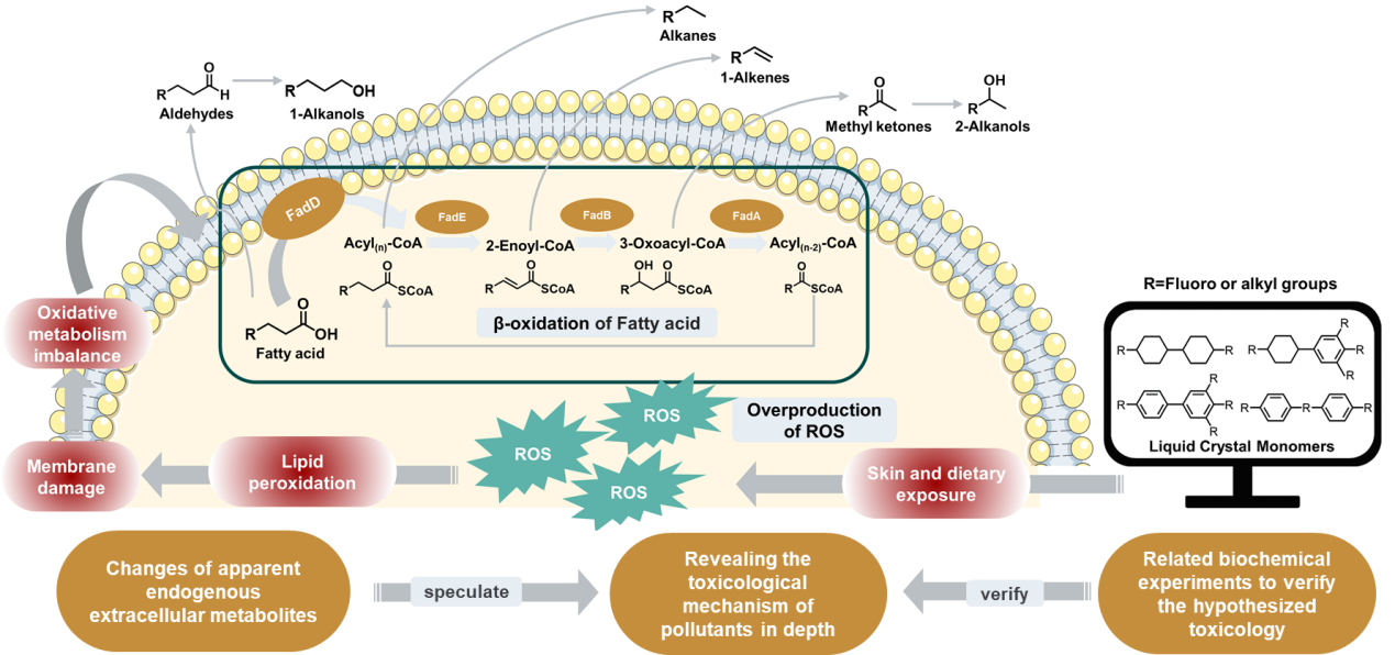 另一项研究中,研究团队与中山大学相关团队合作,研究环境相关水平LCMs(液晶单体)暴露对表皮葡萄球菌和大肠杆菌生长、代谢、酶活力及mRNA表达等过程的影响。结果表明,LCMs对表皮葡萄球菌的生长抑制率高于大肠杆菌,代谢组学分析结果显示两种细菌的脂肪酸代谢失调相关产物占差异物质总数的50%以上,而与氧化应激相关的酶活性和mRNA相对表达水平证实LCMs暴露导致细菌产生氧化应激反应和脂质过氧化。研究结果揭示了LCMs暴露使细菌产生过量的活性氧和自由基,引起脂质过氧化并导致膜损伤,进而影响细胞膜的正常氧化代谢功能的毒性机制。