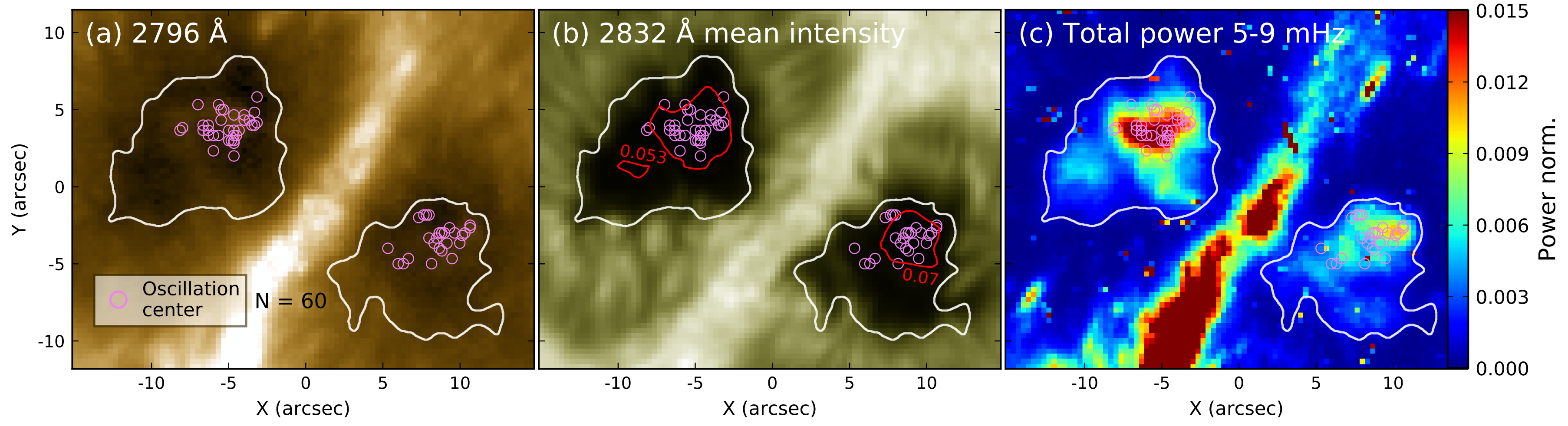 此外,通过统计单臂螺旋波模式的振荡中心在本影内的空间分布,研究人员发现色球层本影波在5—9兆赫的高振荡功率区域反复触发,并且大部分的本影波发生在本影的暗核和强磁场区域,而不是暗核之外那些磁对流更强的区域。因此,此项研究表明,色球层本影波很可能由声学波驱动。