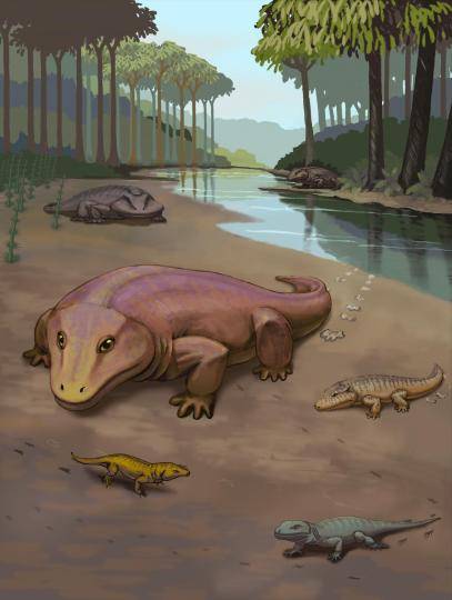 羊膜动物(包括现生的爬行类、鸟类、哺乳类)是真正的陆生生物,繁殖不需要水环境,其出现与早期演化被认为和泛大陆的形成息息相关,自其出现以来一直是陆地生态系统最重要的组成部分之一。最早的羊膜动物诞生于3.2亿年前的泛大陆西缘,体型类似蜥蜴,并在随后的2000万年里迅速辐射演化,在二叠纪的最早期,已经分化成爬行类和下孔类形态各异的诸多肉食和植食种类,遍布泛大陆。