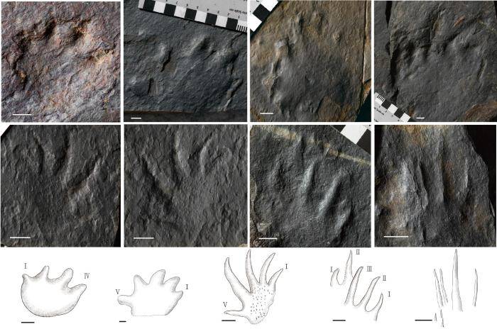 北京门头沟足迹动物群的主要四足动物脚印,包含两栖动物和羊膜动物脚印。中国科学院古脊椎所/供图