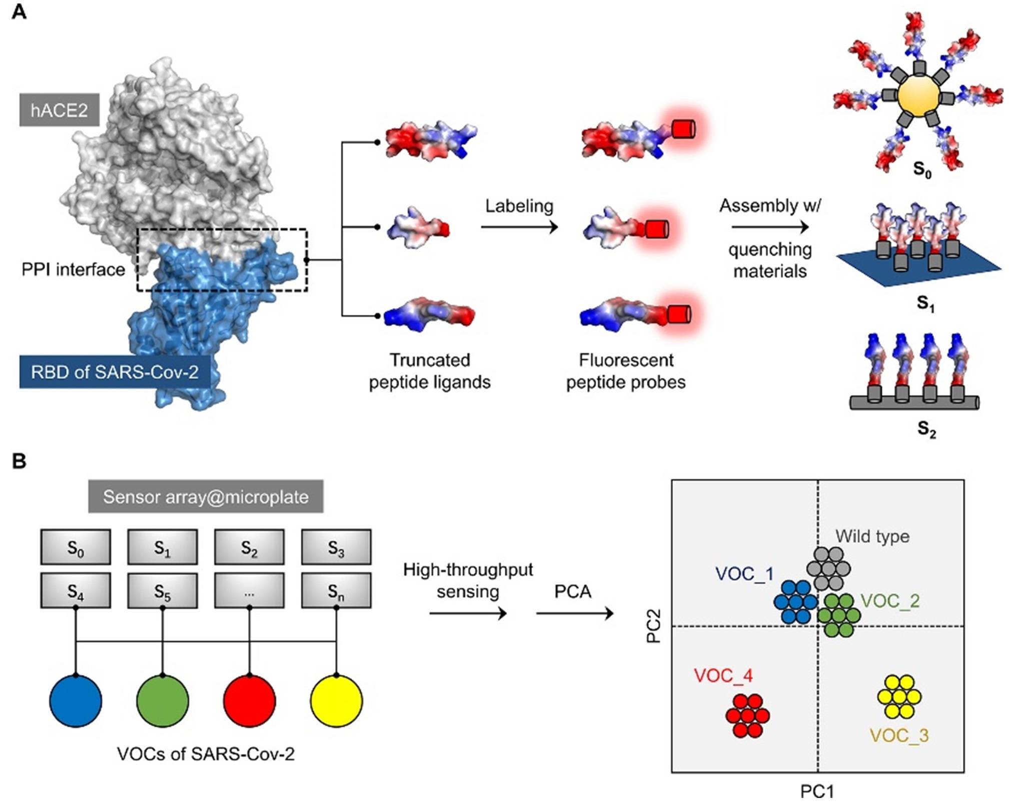 研究团队解析了新冠病毒刺突蛋白受体结合域(RBD)与人细胞受体hACE2相互作用的界面,再将后者截短并剪接多个结合多肽,发现部分多肽保有本征螺旋结构。通过引入荧光标签,与多种具有荧光猝灭效应低维材料的超分子复合,研究人员构建了荧光可竞争激活的多肽传感阵列。荧光酶标仪高通量正交筛选及主成分分析结果表明,多肽阵列可在一株原始株存在下,有效区分世界卫生组织高度关切的5个新冠变异株(VOC),分析结果与病毒的系统发育树一致,并与病毒感染力高度关联。多肽可通过与RBD的竞争结合,引导阵列体系不同程度的荧光呈现,进一步对这些荧光特征信号集进行降维分析,从而实现病毒精准分型。