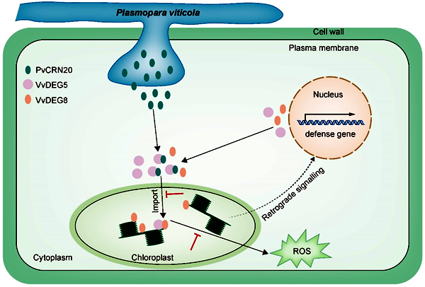 该研究发现了葡萄霜霉菌分泌的胞内效应因子PvCRN20是一个重要的致病因子,能够抑制INF1-和Bax-诱导的细胞死亡,并促进病原菌侵染。进一步研究发现PvCRN20能够在植物细胞质中与叶绿体蛋白酶DEG5互作,但不与其位于叶绿体中的互作蛋白DEG8相互作用。