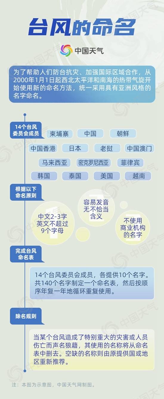 由于国家和地区众多,每个地方的风格都不一样,取的名字也是五花八门。中国大陆提供的名字以神话人物和植物为主,像悟空、风神、海神、海棠、银杏、木兰等;中国香港和中国澳门提供的名字更生活化,有女孩名字珊珊、玲玲,有当地特色食物贝碧嘉、鸳鸯,有著名地标三巴、西望洋、青马、狮子山,还有常见的动植物等。