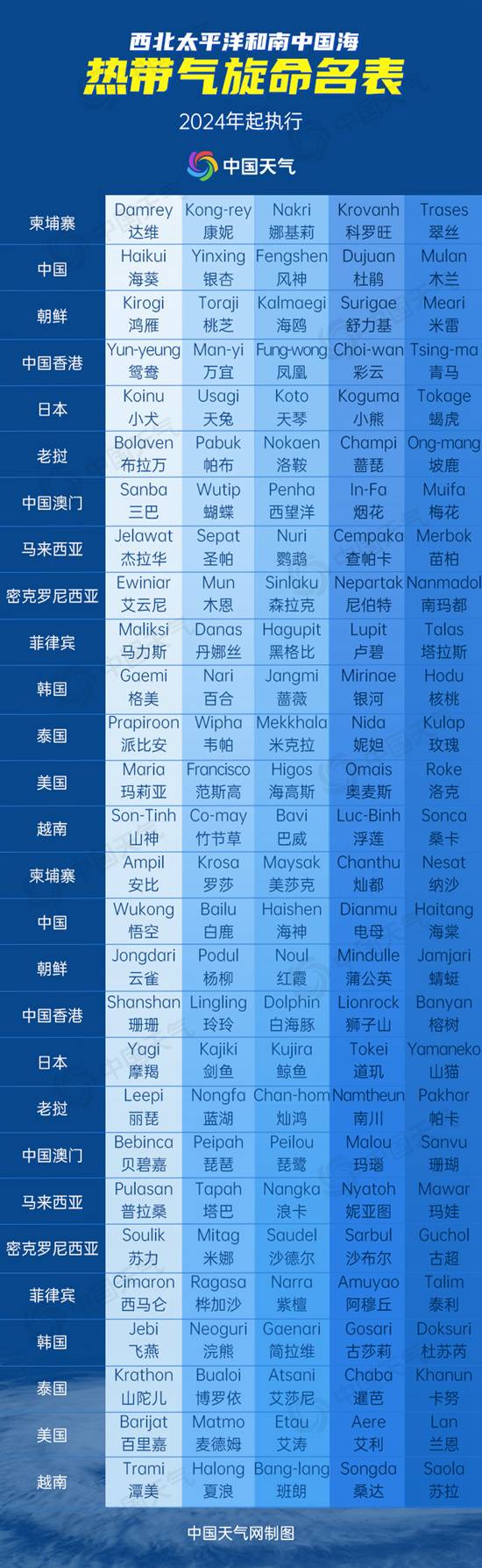 这张新的命名表共有140个名字,由世界气象组织所属的亚太地区的11个成员国和3个地区分别提供10个名字,按顺序分别是柬埔寨、中国大陆、朝鲜、中国香港、日本、老挝、中国澳门、马来西亚、密克罗尼西亚、菲律宾、韩国、泰国、美国以及越南。