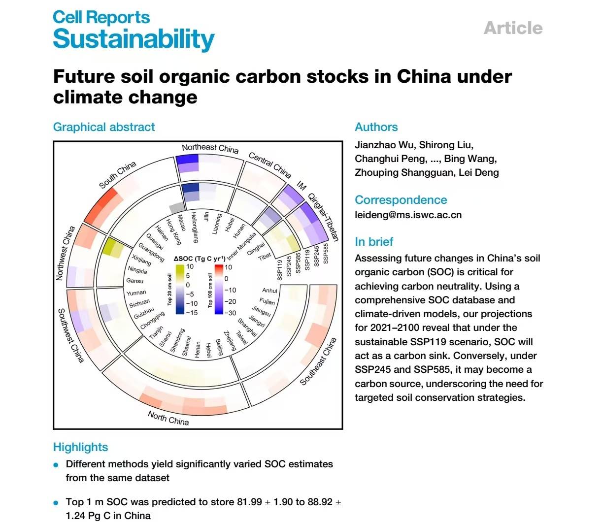 近日,西北农林科技大学黄土高原土壤侵蚀与旱地农业国家重点实验室邓蕾研究员团队评估了不同共享社会经济路径(SSP)下我国陆地生态系统土壤有机碳储量潜在趋势。相关研究成果发表在Cell press旗下新出版的《细胞报告可持续性》(Cell Reports Sustainability)上。