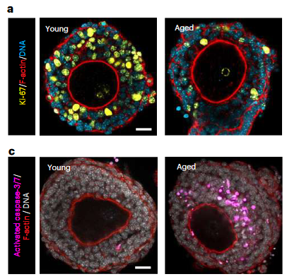 卵母细胞(未成熟的卵细胞)在被称为卵泡的体细胞包裹中生长和成熟。卵泡细胞与卵母细胞直接接触,为卵母细胞的发育提供重要的营养和支持。在衰老过程中,卵母细胞的数量和质量都会下降。目前,尽管辅助生殖技术(如冷冻保存年轻卵母细胞)发展得很好,但还没有临床上可行的策略可以恢复老龄卵母细胞的发育潜力。