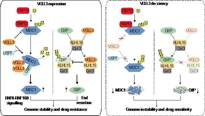 研究发现,在DNA双链断裂发生后,VGLL3能够被迅速招募至损伤部位。而VGLL3的招募依赖于多聚ADP-核糖化修饰介导的染色质重塑和VGLL3的N端谷氨酸富集区。敲低或敲除VGLL3能够抑制肿瘤细胞的同源重组,同时,敏化肿瘤细胞对多种化疗药物如依托泊苷、喜树碱和表阿霉素以及PARP抑制剂的响应。进而,研究显示,VGLL3可以通过抑制DNA双链断裂修复中两个关键蛋白CtIP和DNA损伤检测蛋白1的蛋白酶体依赖性降解,促进DNA双链断裂末端剪切和RNF8/168信号通路,协同增强DNA双链断裂修复。研究发现,缺失VGLL3的谷氨酸富集区或组氨酸富集区将抑制肿瘤细胞的同源重组、敏化肿瘤细胞对化疗药物的响应。进一步,小鼠移植瘤实验证实敲低VGLL3,抑制肿瘤生长、增强化疗敏感性;而谷氨酸富集区或组氨酸富集区缺失干扰了VGLL3的促肿瘤生长和耐药能力,表明靶向抑制VGLL3的同源重组功能可以增强肿瘤化疗效果。