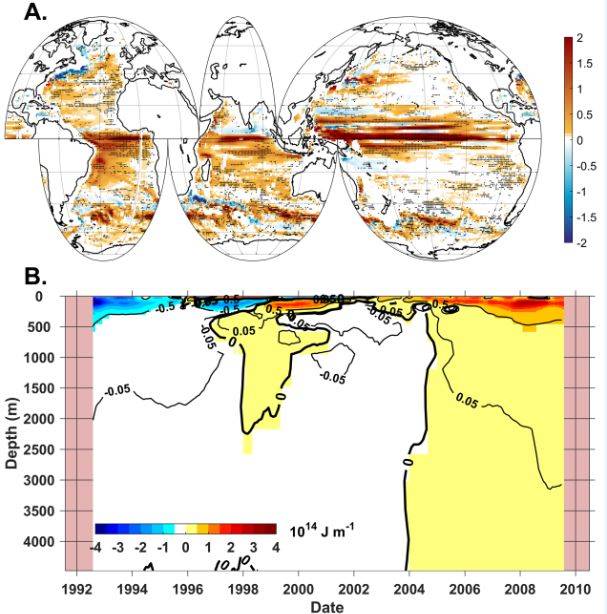 全球平均海洋环流加速的时空特征。(A)1990年以来上2000米大尺度海洋环流动能的线性趋势;(B)多源数据集合的全球平均海洋环流动能时间序列(摘自Hu et al., 2020, Science Advances)