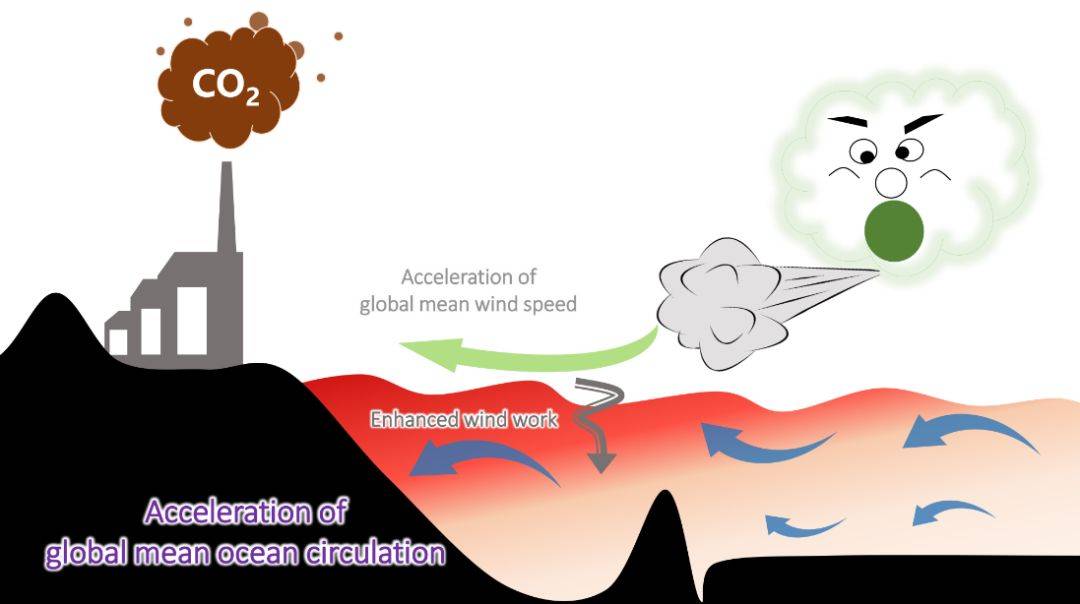 全球平均海洋环流加速物理过程卡通图。黑色阴影示意大陆和海底,灰色工厂和“CO2”示意人类活动引起的温室气体排放,蓝色箭头指示全球平均海洋环流加速,绿色箭头表示全球平均风速增加及其风做功加强。持续性温室气体排放导致的外强迫被认为是全球平均风速增强和全球平均海洋环流加速的主要原因(胡石建绘制)