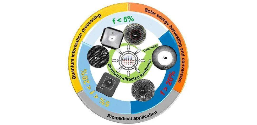 异质纳米晶以纳米或量子尺度的金属或半导体材料做为基元构件,在催化、能量转化与存储、光电器件、生物医学诊断与治疗、量子信息处理等领域具有重要的应用前景。大量研究表明,不同基元构件之间异质界面的晶格结构与电子特性对异质纳米晶的整体性能具有关键性作用,其深层原因是界面处晶格失配度的大小从热力学上决定了晶体生长的不同机制。因此,晶格失配度是异质纳米晶合成与应用中的一项重要参数,其不仅与异质纳米晶合成的难易程度密切相关,同时会对所合成材料界面处的晶格缺陷及晶格应变状态产生直接影响,从而可进一步用于调控异质纳米晶的电子与光学特性。