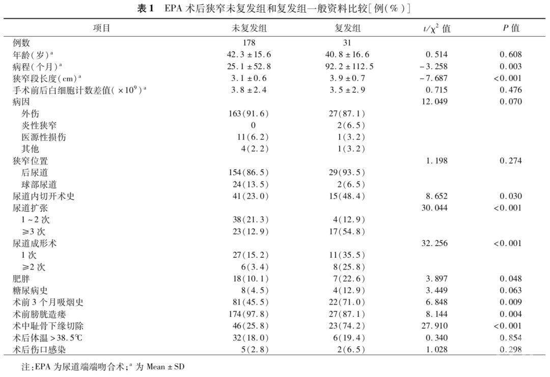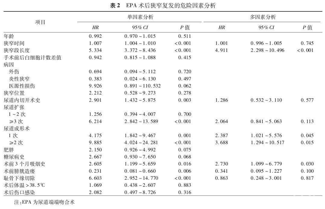 分析尿道狭窄患者行尿道端端吻合术(excision and primary anastomotic urethroplasty,EPA)后狭窄复发的危险因素。
