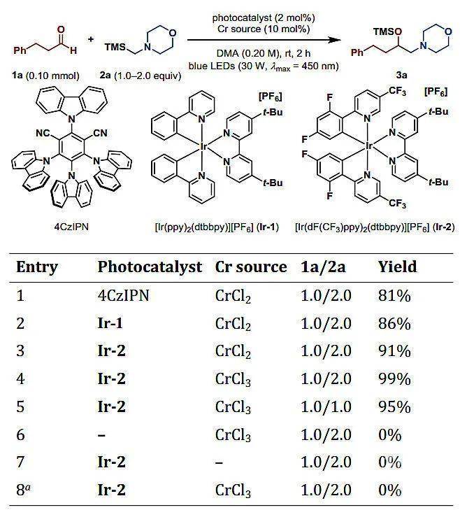 作者以醛1a与α-硅基胺2a作为底物,在可见光照射下,以有机染料4CzIPN和CrCl2作为催化剂进行反应(图2)。值得注意的是,反应2 h后,在各种极性非质子溶剂中均可得到硅基保护的1,2-氨基醇产物3a,其中在DMA中的产率为81%,使用光催化剂[Ir(dF(CF3)ppy)2(dtbbpy)][PF6](Ir-2)可以将收率提高到91%。CrCl3也可以作为催化剂,并且大大提高了该反应的收率(高达99%)。