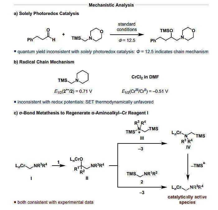 最后,作者通过各种实验对反应机理进行了深入的研究。Stern-Volmer荧光淬灭实验表明原料和产物均能淬灭激发态的光催化剂,但α-硅基胺的淬灭常数约为产物的50倍,表明光催化剂由α-硅基胺还原淬灭。该试验中的量子产率为12.5(图4a),表明该反应为链反应机理。考虑到所涉及的反应物的氧化还原电位,α-硅基胺2(E1/2(2•+/2) = 0.4 - 0.8 V)会将LnCrIII还原(E1/2(CrIII/CrII) = -0.51 V),从热力学角度来看这是一个非常不利的步骤,因此该反应不太可能为自由基链反应机理,应该是通过另一种不同于氧化还原步骤的机制进行。作者给出了一个可能的解释,他们认为烷氧基铬II与TMS胺复合物III或α-硅基胺2发生了σ键的复分解反应。也就是说,σ键复分解会生成Cr-胺类物种IV,在失去TMS+后可再生具有催化活性的α-氨基烷基Cr物种I;或者σ键复分解直接生成α-氨基烷基Cr物种I。这些机制仅通过LnCrIII中间体进行,与实验数据一致,对该反应机理的进一步研究仍在进行中。