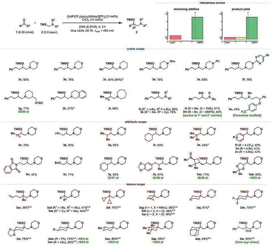 Frank Glorius课题组通过Cr/光氧化还原双催化系统,以一种温和的、化学选择性的羰基氨烷基化反应,实现了硅基保护的1,2-氨基醇的合成,反应中原位生成了碳负离子的等价物—α-氨基烷基铬试剂。该反应条件温和,底物适用性广,当相应的环氧化合物不易获得时,这种方法可以替代传统的1,2-氨基醇的制备方法。酮类和酰基硅烷的官能团化证明了该双催化系统的独特性质。