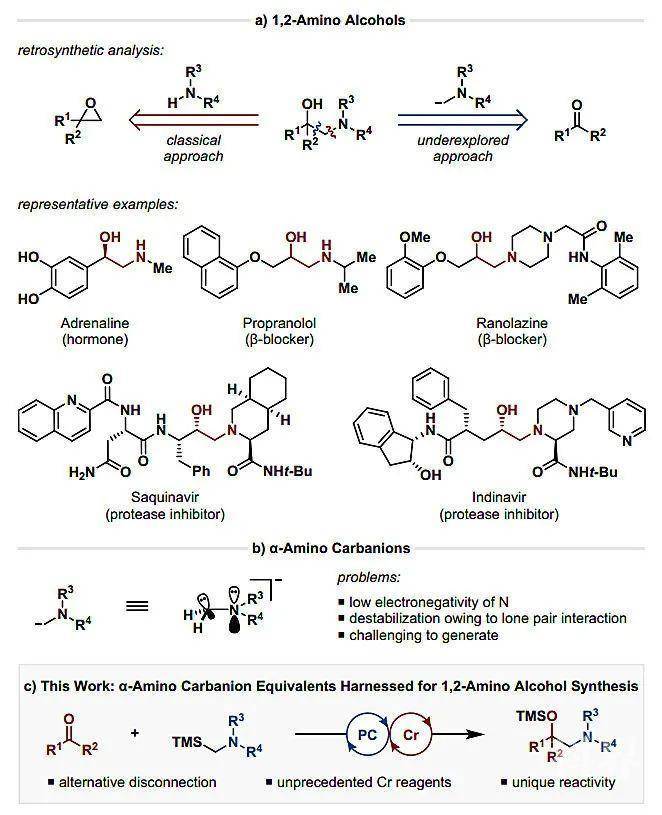 1,2-氨基醇是各种天然产物、药物活性分子和特殊配体的重要单元。据统计,已知含有该结构的化合物超过30万种,其中包括超过2000种的天然产物、80种FDA批准的药物和100种候选药物,因此其合成受到了有机化学研究者的广泛关注。通常情况下,1,2-氨基醇由胺类化合物与环氧化合物的亲核开环反应来制备(图1a)。然而,环氧化合物的反应活性高且通常难以制备,使得该方法的选择性和后期适用性存在一定的缺陷。此外,根据逆合成分析,1,2-氨基醇还可以通过碳负离子对羰基进行加成,但这种方法目前仍未开发,这是因为α-氨基碳负离子上的N孤对电子与碳负离子之间的不稳定相互作用,使其难以对羰基进行加成。另外,α-氨基碳负离子通常由锡化物或有机锂化物通过金属转移来形成。由于含锡原料、副产物的毒性以及有机锂化物的高反应活性带来的官能团耐受性和原子经济性等问题,使得这种方法具有很大的局限性。