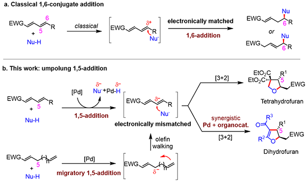 我们在设计合成γ-烯基联烯酸酯的基础上,实现了膦催化的远程1,7-加成反应,得到了1,3-双烯酸酯化合物。反应表现出很好的收率和区域选择性,也有很好的底物适用性。当使用含有两个a-氢的1,3-双羰基化合物作为前亲核试剂时,我们以中等到好的收率得到了远程双1,7-加成产物。
